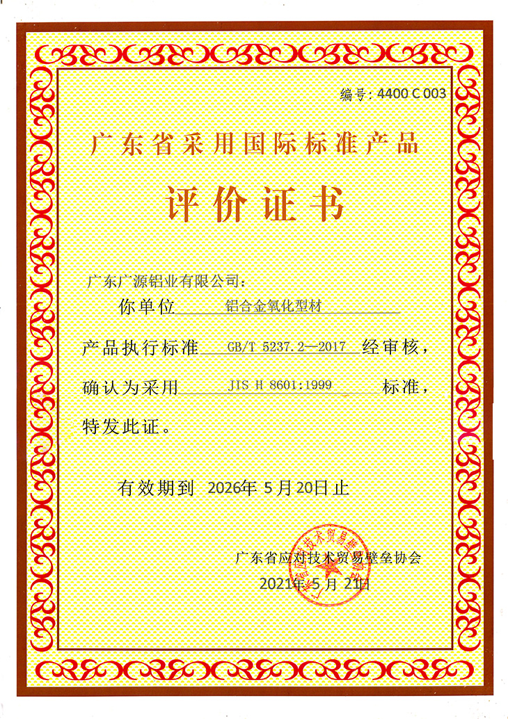 鋁合金氧化型材評(píng)價(jià)證書(shū)